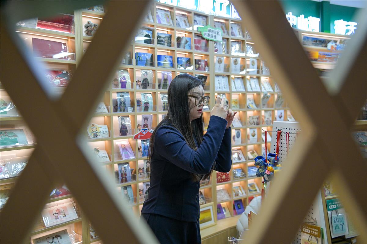 工作人員向觀眾介紹草原信使主題郵局里的文創(chuàng)產(chǎn)品。